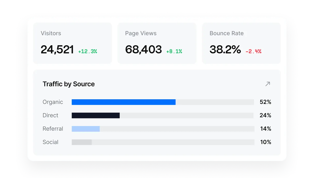 Total visitors, page views, sessions, bounce rate. Broken down by source, device, and time period.