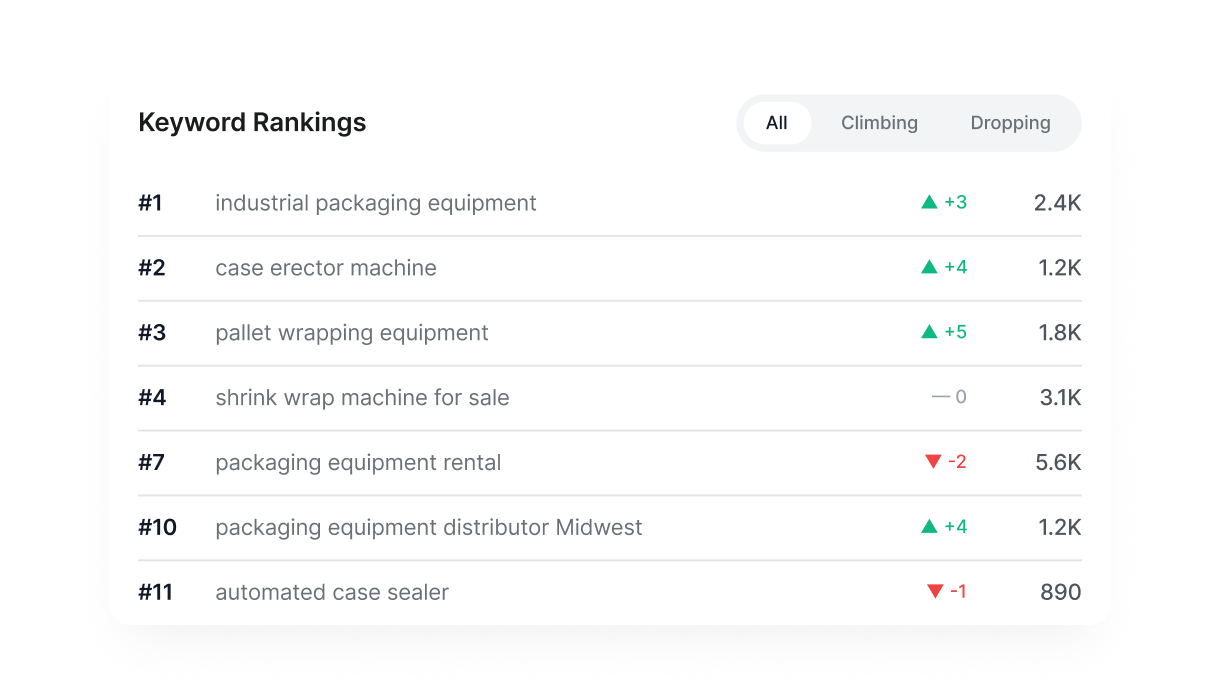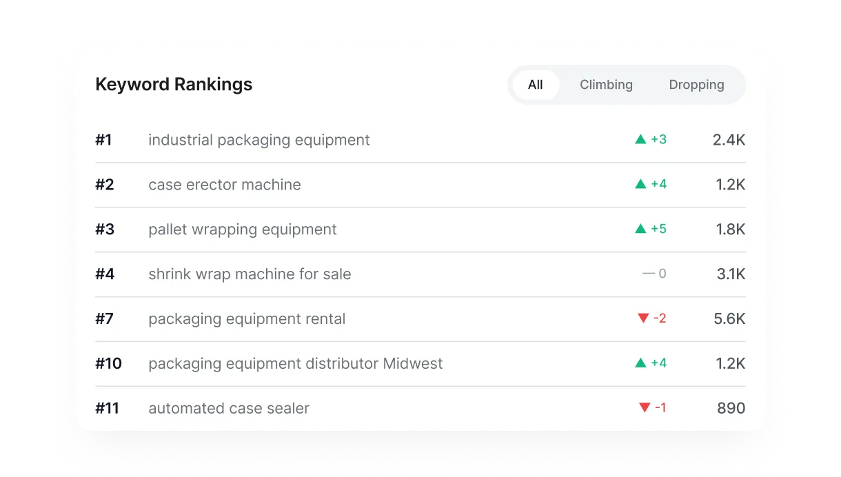 Monitor keyword positions over time. See what's climbing, what's slipping, and where you stand against competitors.