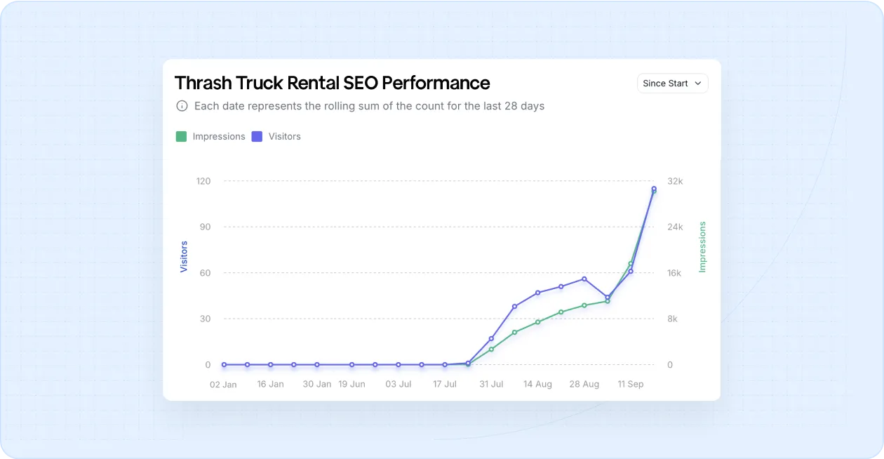 Trash Truck Rental partnered with Gushwork in June 2025 for complete digital transformation. What happened over the next 90 days? A strategic AI SEO approach generated 14 qualified leads while achieving #1 rankings for their most valuable keywords. Read on to see how three months of focused execution transformed their business.